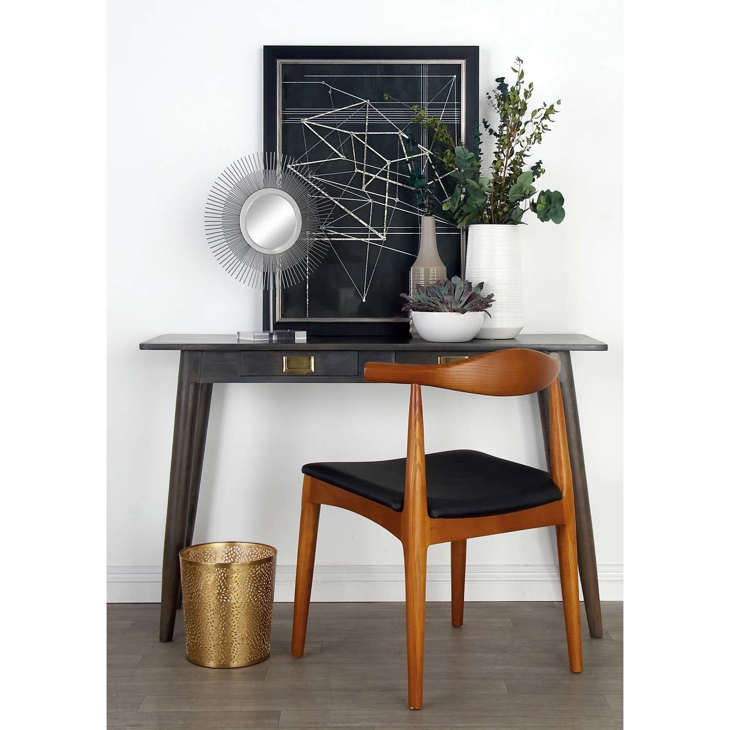 This 1.3 Gallon Round Perforated Copper Gold Metal Waste Basket Trash Can is functional and decorative filler of bare home spaces. This item ships in 1 carton. Suitable for indoor use only. This item ships fully assembled in one piece. Made in India. This is a single-colored office wastebasket. Glam style. Elevate your space and add a touch of luxury with this glam-inspired piece. This classy waste basket is made with solid iron. Item features a full metallic finish. This is crafted with perforated chrysanthemum patterns and a slightly slanted cylinder structure. Wipe clean with a dry cloth. The waste bin features a tapered cylinder body with a perforated pattern. Iron welded together to form waste can with a solid structure. This item measures 9L x 9W x 10H inches, and weighs 1.65 lbs. Indulge in the glamorous luxury of plush textures, dazzling details, and sleek finishes to elevate your home and add a sophisticated flair.