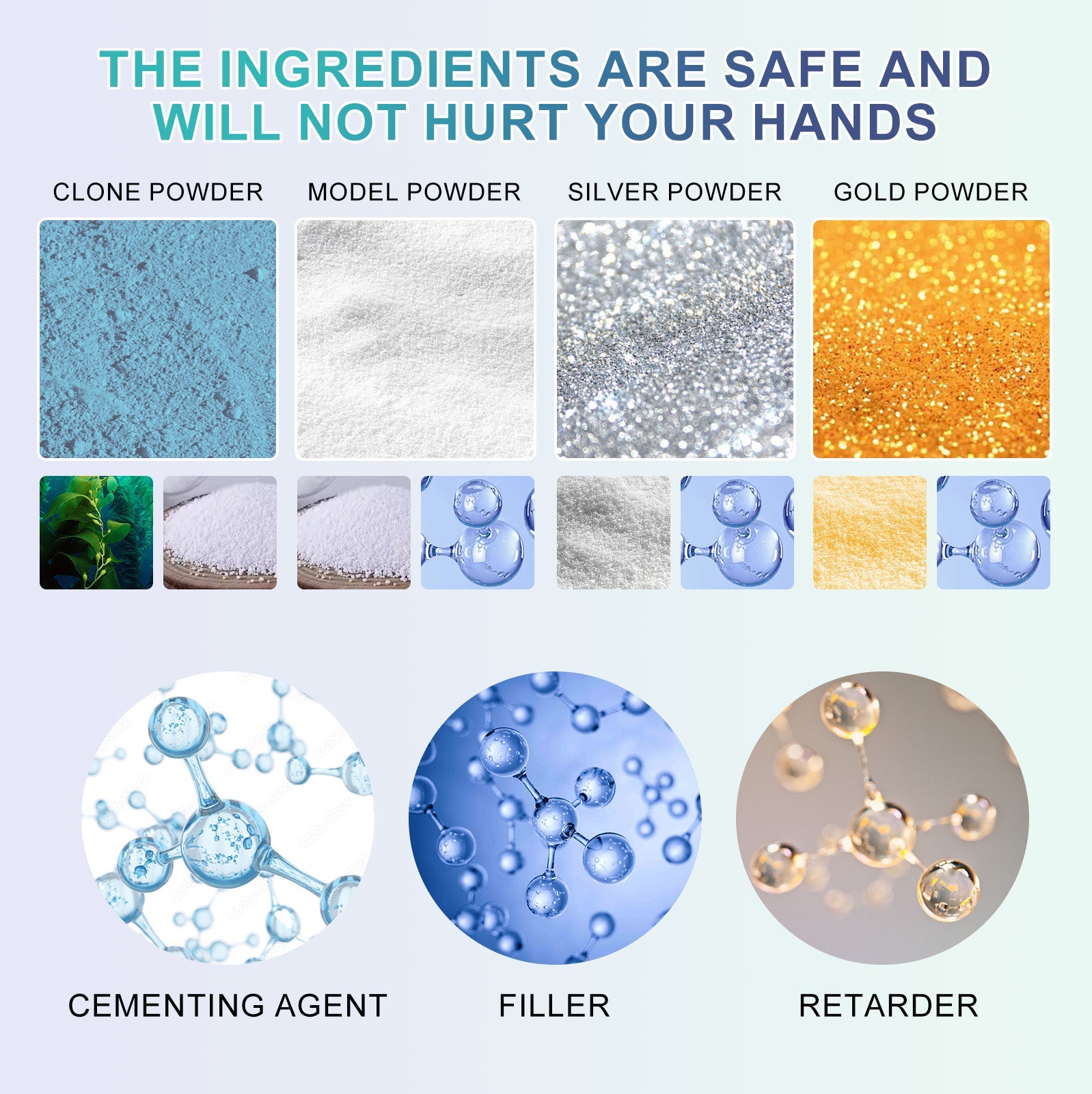 Our Diy For Love Keepsake Hands Casting Kit contain binder, retarder and filler. It can record the growth process, fine capture every fine line and fingerprint, so that you create a more perfect product, is a kind of love witness. It is simple to use: add the clone powder and water in a bucket with a mixing stick, stir it evenly, put your hand in the solution for 3-5 minutes, let it change color and set, then gently shake your hand and take it out. Add the molding powder and water to another bucket and mix well with a mixing stick. Pour the mixture into the mold and pat the edge of the bucket to reduce air bubbles. Wait for more than 30 minutes to cure before peeling off the clone layer. After peeling, process and color with sandpaper as needed. Perfect for teens, adults, couples and friends to create priceless memories together, it's a great choice for gift-giving.