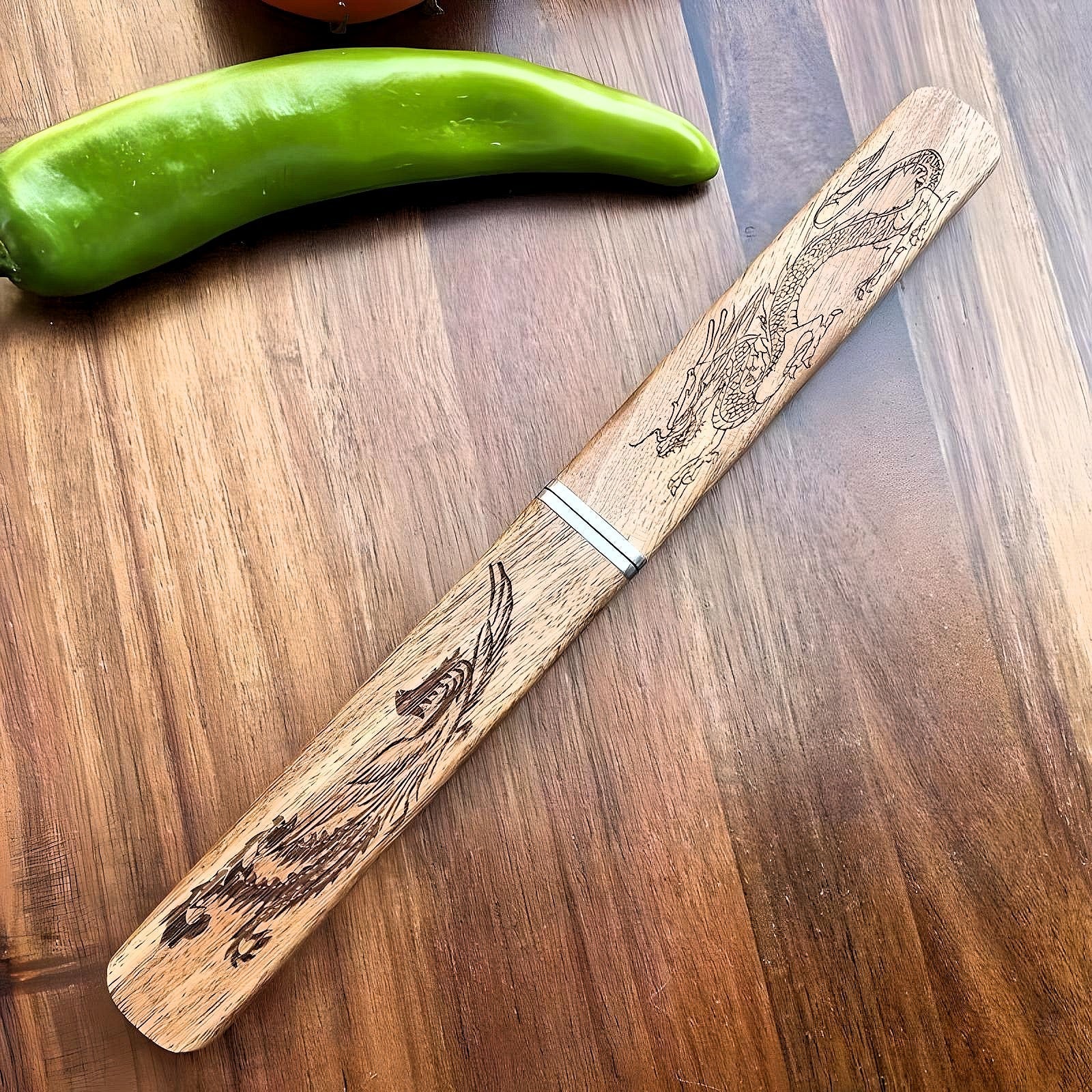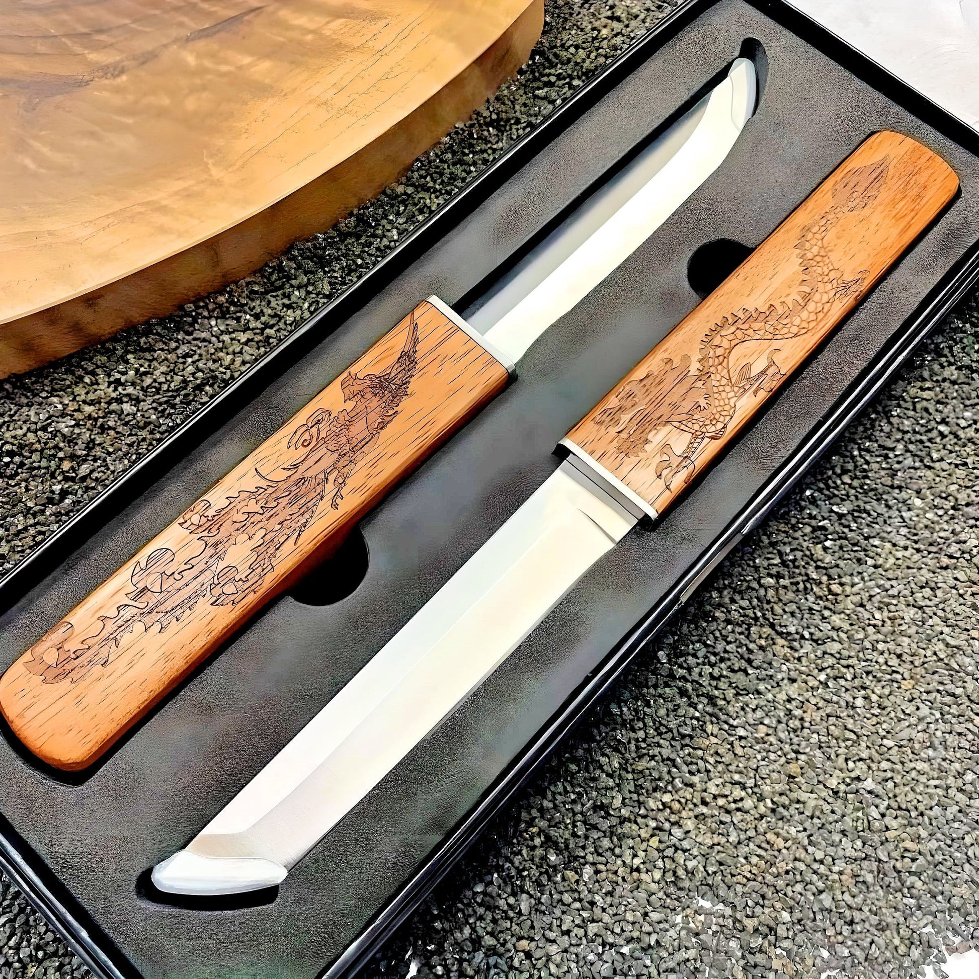 DragoPhoenix Duo, a handcrafted double-edged knife set designed for versatility, durability, and elegance. Whether you're slicing, peeling, or cutting with precision, this stainless steel knife set offers unparalleled sharpness and ergonomic comfort, making it the ultimate companion for your kitchen and outdoor adventures.