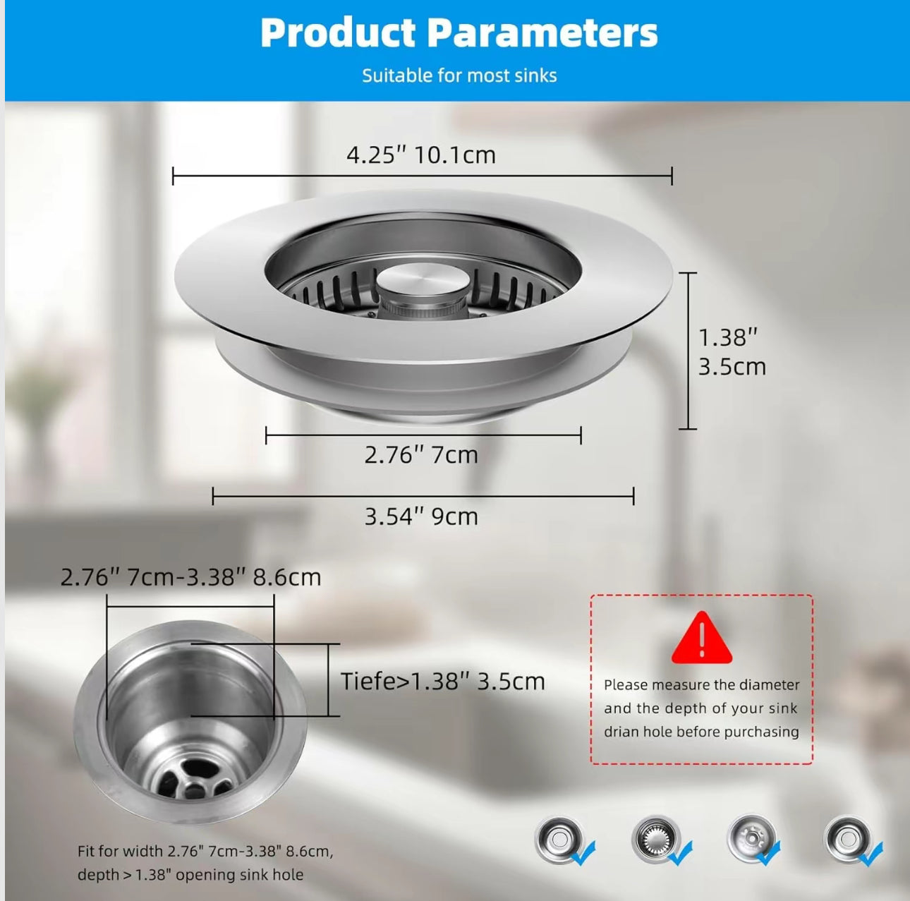 Designed to fit US standard 3-1/2 inch drain holes (2.76"–3.38" wide, >1.38" deep). Please measure your sink opening for best fit before ordering.