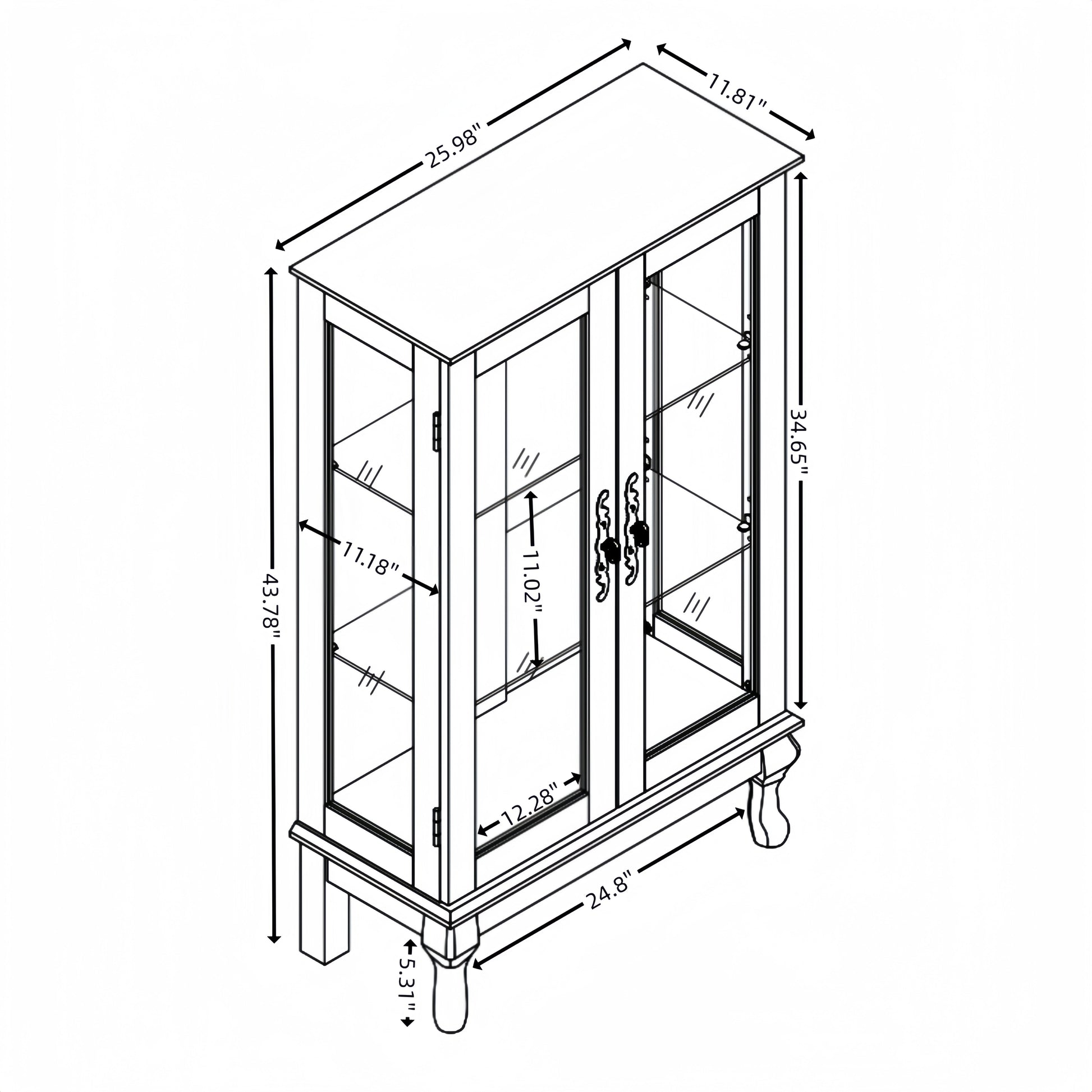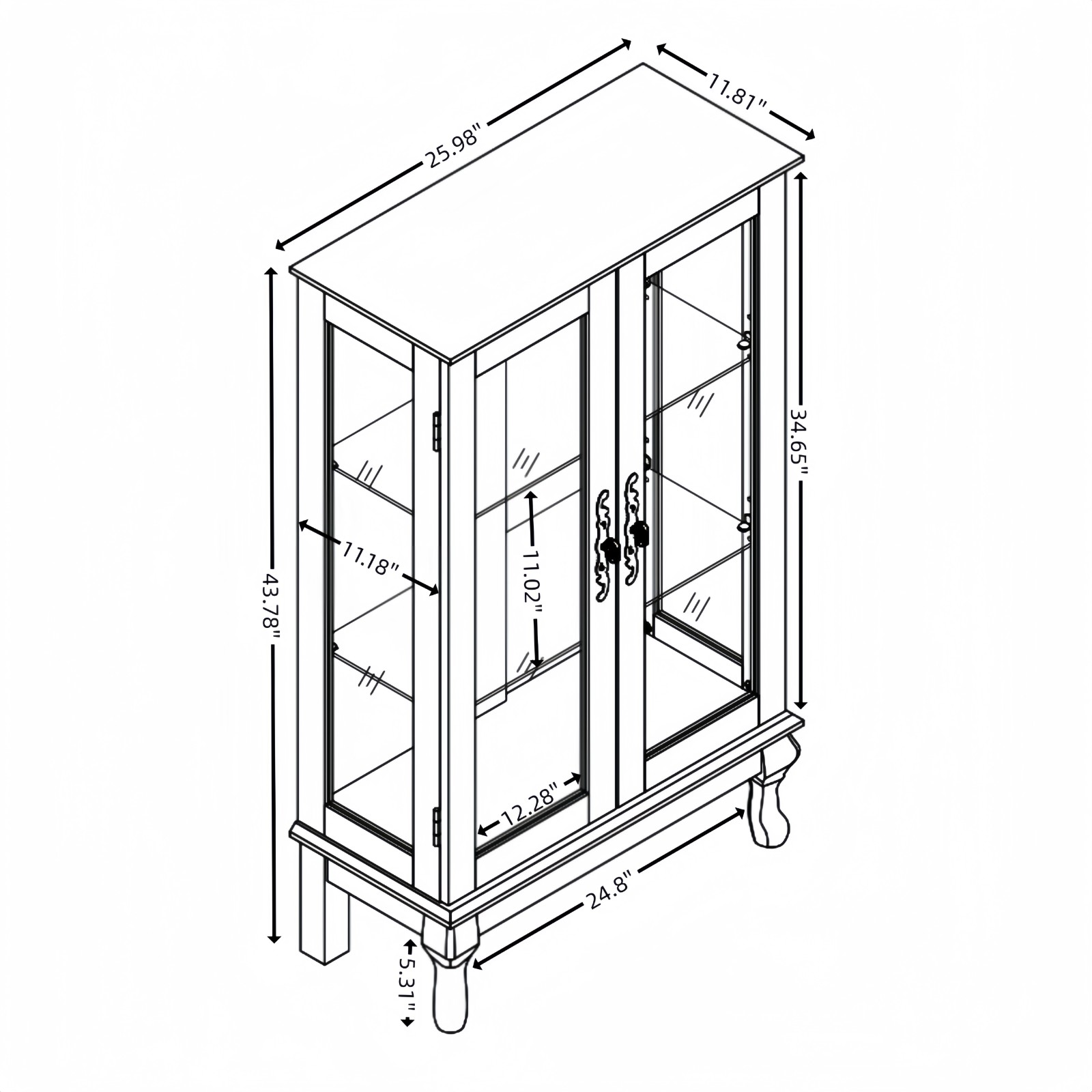 Spacious and Elegant Cabinet:This exquisite curio cabinet, featuring glass doors, boasts a total of three shelves that offer ample and versatile storage space. It includes one fixed wooden shelf and two adjustable tempered glass shelves, each capable of holding between 15 to 22 pounds. This cabinet is perfect for storing books、wine、 or collectibles.