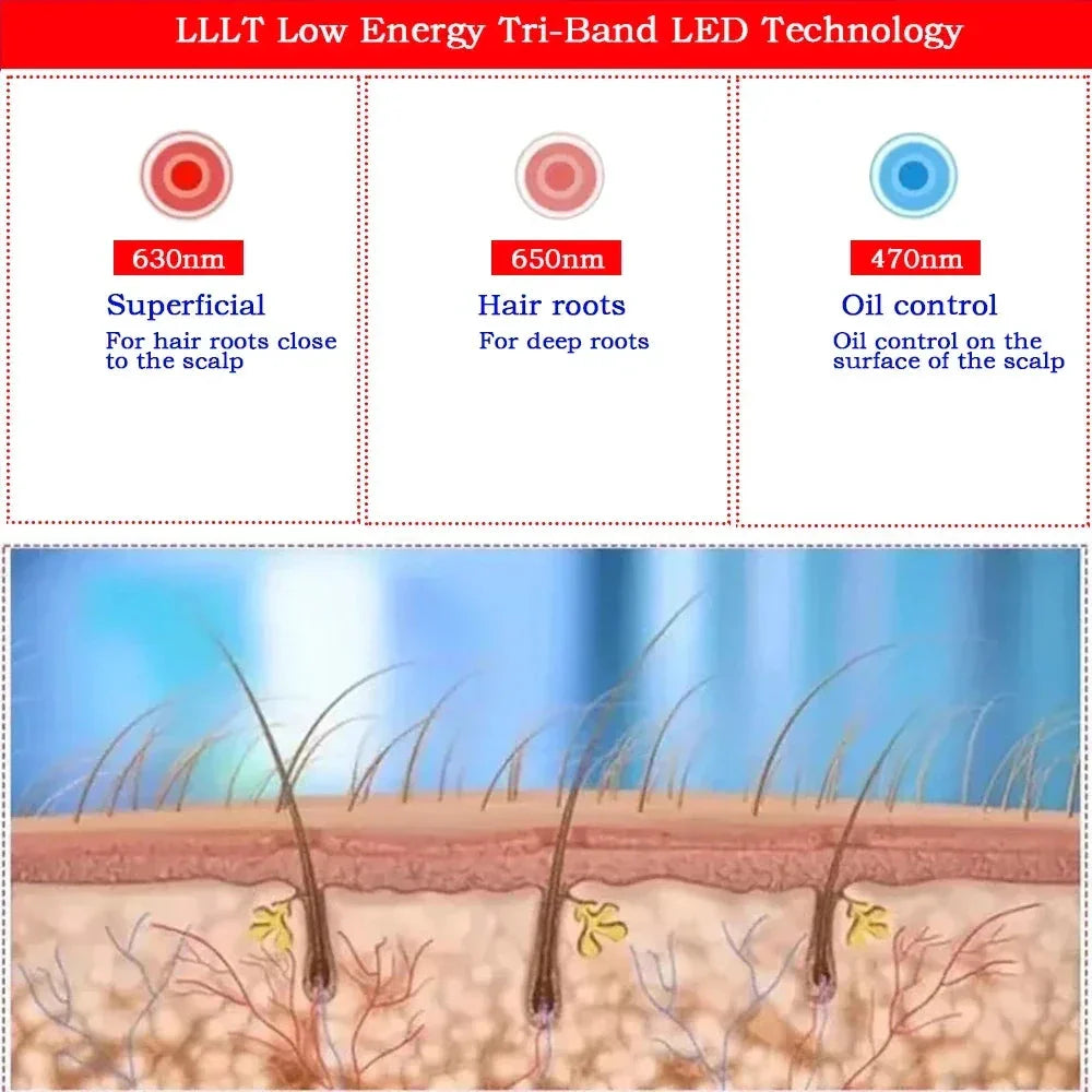 - Red light (630nm & 650nm): Enhances blood circulation, reduces inflammation, and strengthens follicles.