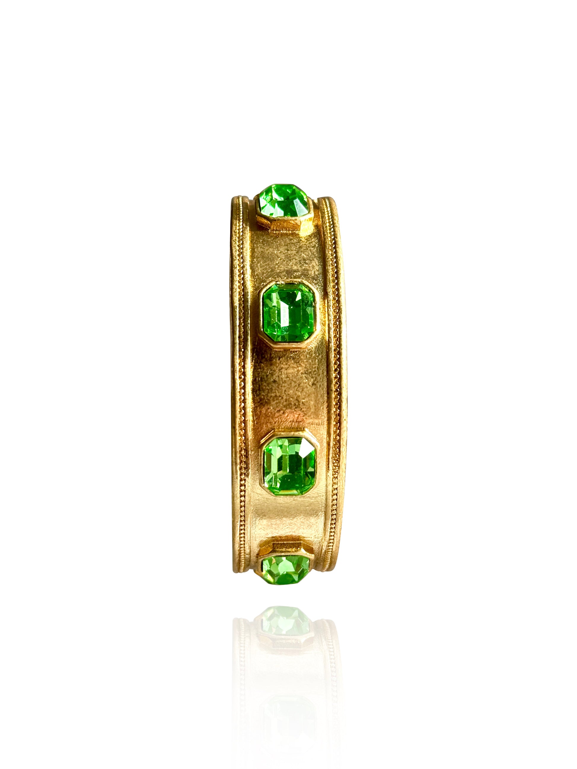 The newest piece in the Laura Gray line! We're thrilled to introduce our gold plated stacking bangles with vintage crystals! Beautiful 14k gold plated brass with a textured finish and delicate Etruscan inspired beaded detailing. Limited quantities of each color due to deadstock vintage crystals.