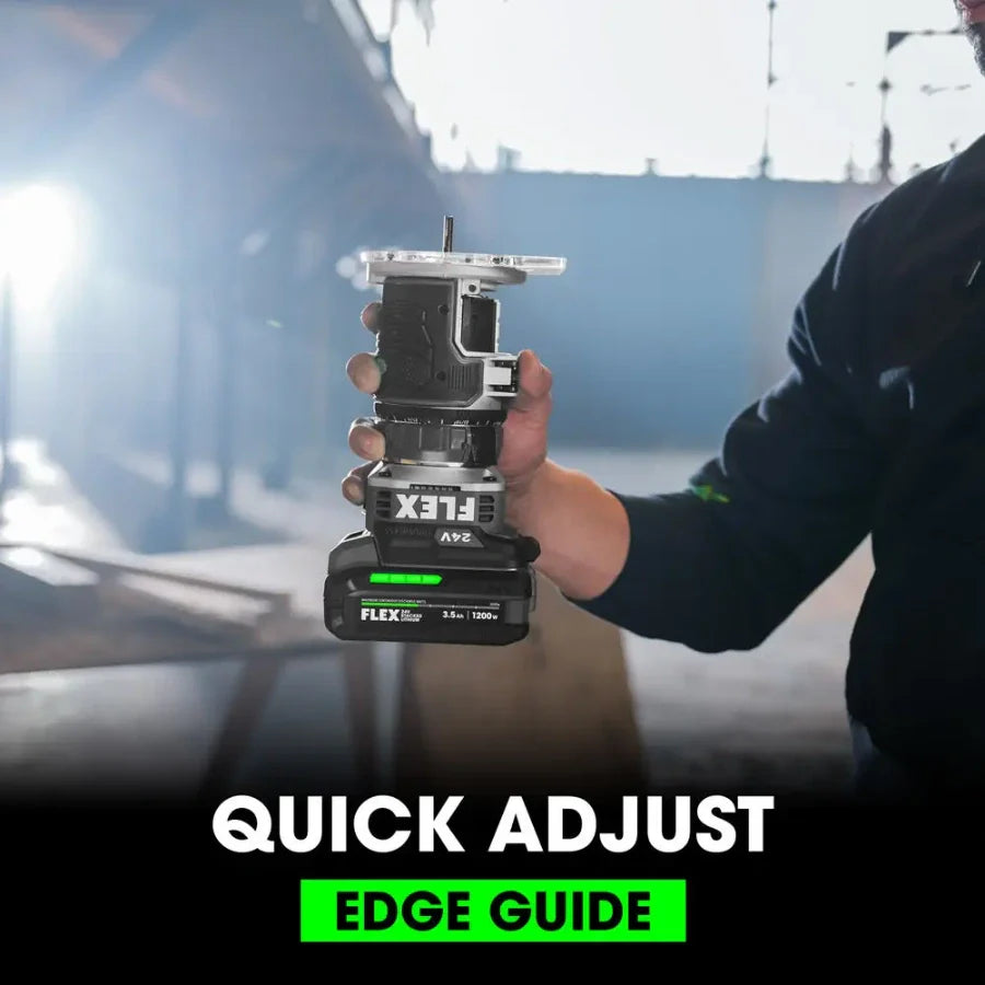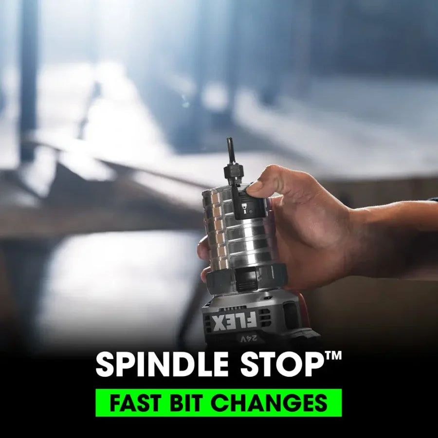 Finish furniture and cabinetry or cut door and window holes from plywood and OSB with the FLEX 24V Trim Router. This 24V trim router tool features a patent-pending Spindle Stop™ shaft lock system for fast, easy bit changes and added safety by preventing accidental startups. Its powerful 1.5 max horsepower brushless motor delivers constant speed under the toughest conditions, and its variable speed dial offers six settings from 16,000 to 31,000 RPM. Quick-release collars deliver easy and reliable depth adjustment accurate to 1/64 inch. This trim router dominates with the FLEX Stacked Lithium Advantage: unmatched battery power, runtime, and charging capability. The cordless trim router kit includes the trim router, a 3.5Ah Stacked Lithium battery, and 160W Fast Charger. It’s all protected by the FLEX Limited Lifetime Warranty when registered within 30 days of purchase at registermyFLEX.com through December 31, 2024.
