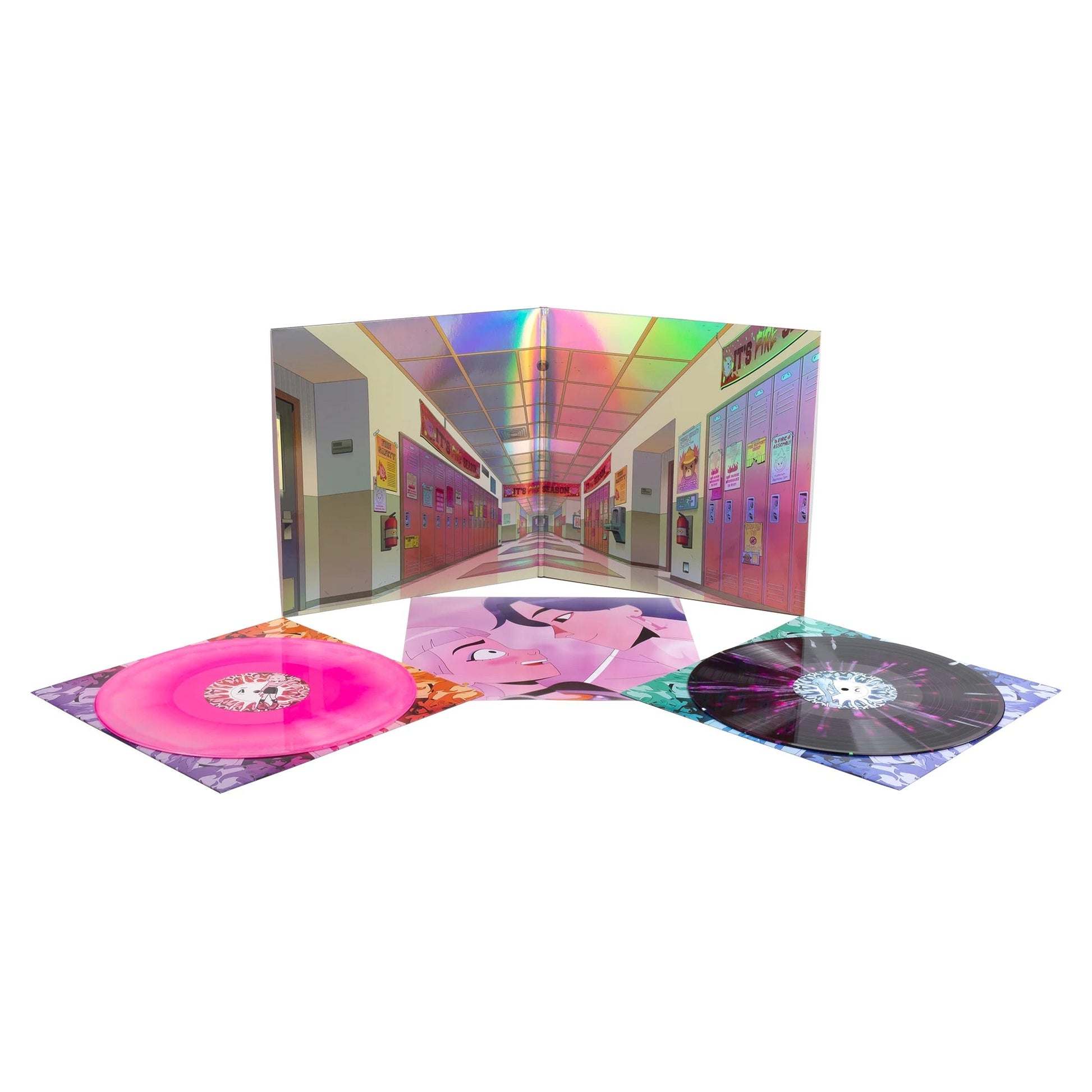 Housed in UV high gloss gatefold packaging with a metallic chrome-detail cover, this double LP includes kaleidoscope printed inner sleeves plus a custom, low-tack character sticker pack to create your own gatefold scene.