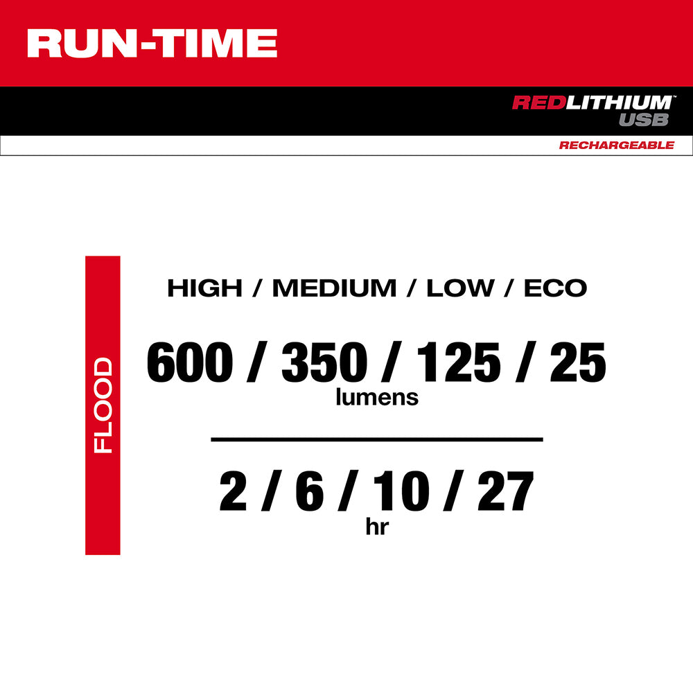 - 4 light output modes: Flood High mode: 600-Lumens- 2 hours; Medium mode: 350-Lumens- 6 hours; Low mode: 125 -Lumens- 10 hours; Eco mode: 25-Lumens- 27 hours