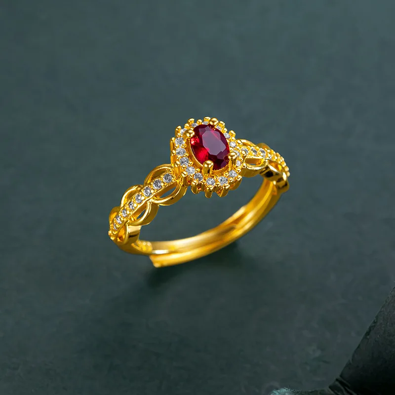 Crafted with a real 14K gold color finish and kissed by a deep crimson zircon, this open-style band radiates warmth, grace, and confidence. It’s a ring that whispers romance but shines like a promise.