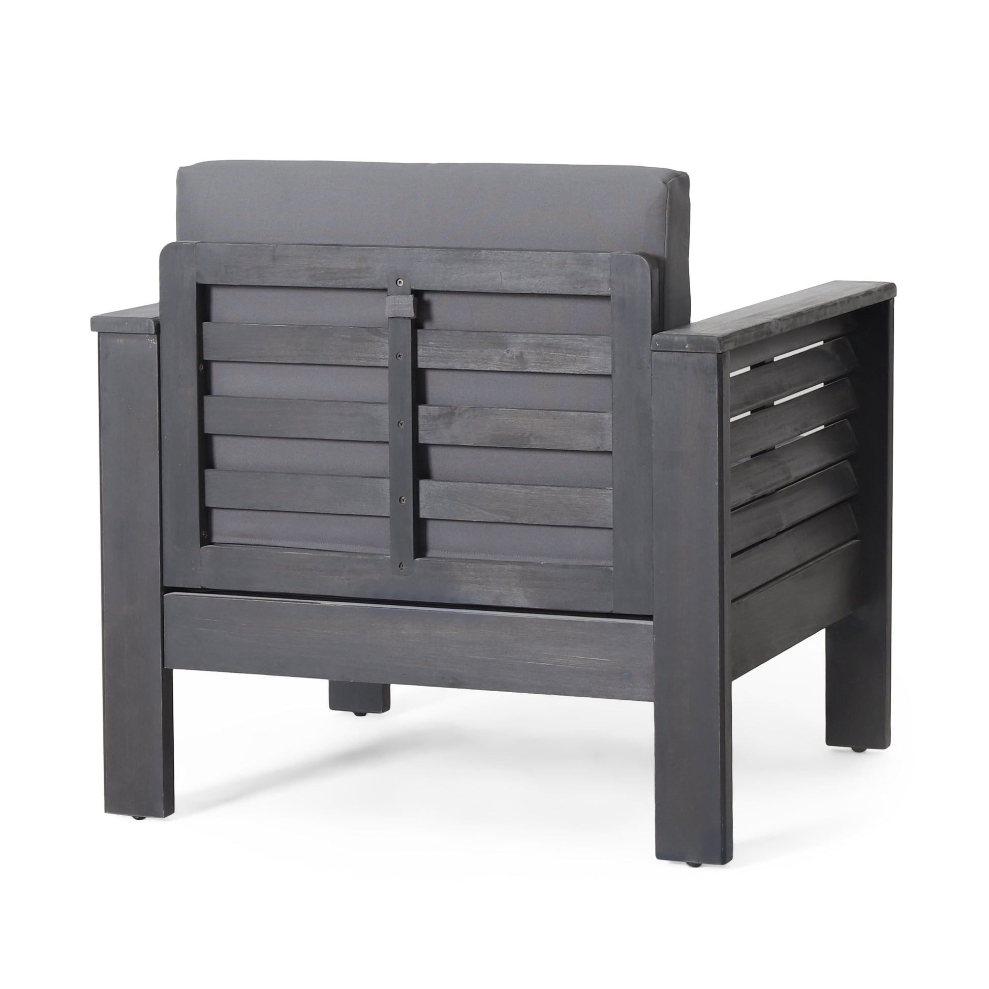 Complete your backyard or patio with a stunning set of chairs that is sure to enrich your outdoor experience. Combining a rich acacia wood and water-resistant cushions, our club chair set will be a flawless addition to any outdoor lounge area. This can be used as a standalone or can be used to accent your existing furniture, making this a dream for those who love to personalize their space. With beautiful shutter-styled slat paneling and a sturdy design, these chairs offer hours of conversation for you and your guests.