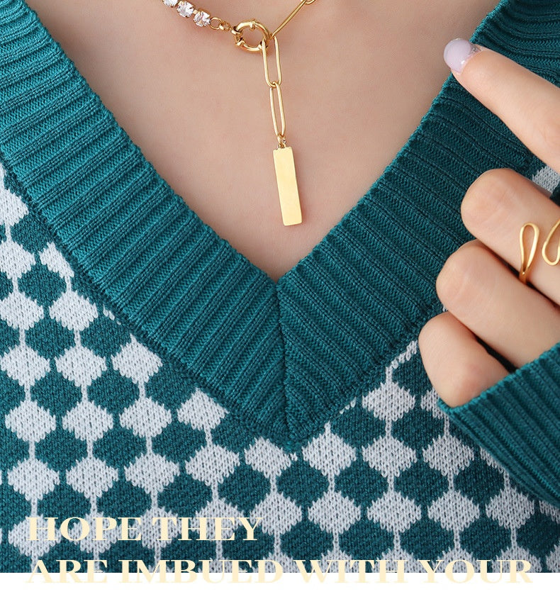 At the center of this striking necklace is its geometric square strip pendant. Available in two stunning finishes—opulent gold and classic steel—this pendant is designed to capture attention and spark conversation. With an electroplated surface, both versions maintain a brilliant shine that lasts. If you love a bit of sparkle, the P122-gold zircon finish is your ideal match. For those who prefer a sleek minimalist vibe, the P122-steel zircon is the perfect choice that effortlessly complements any outfit.