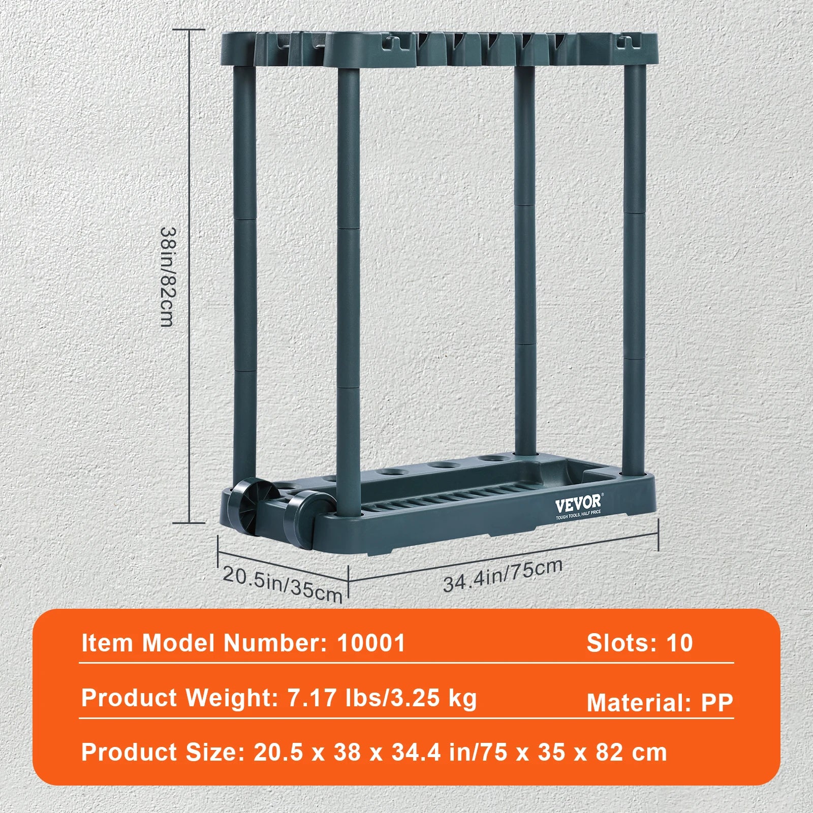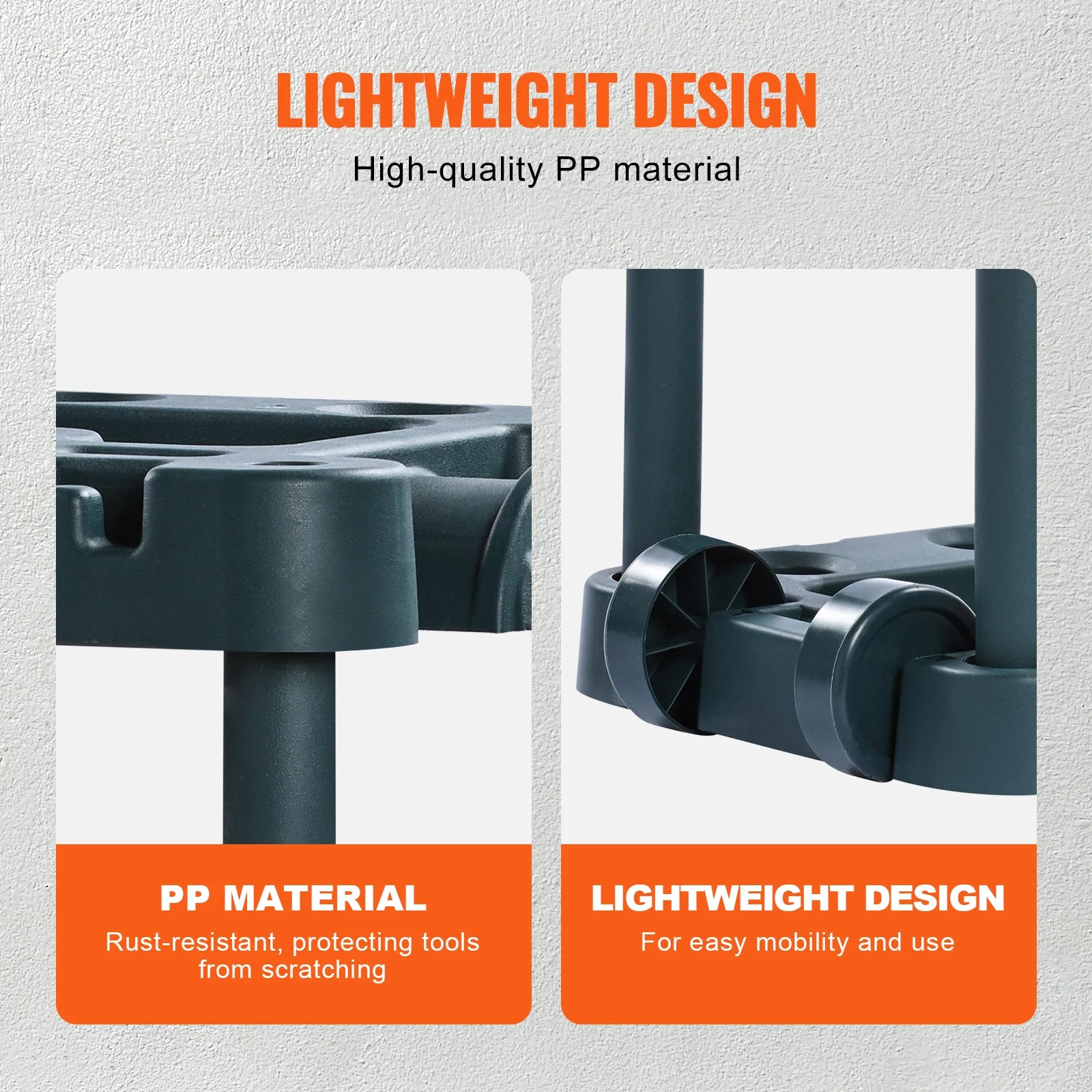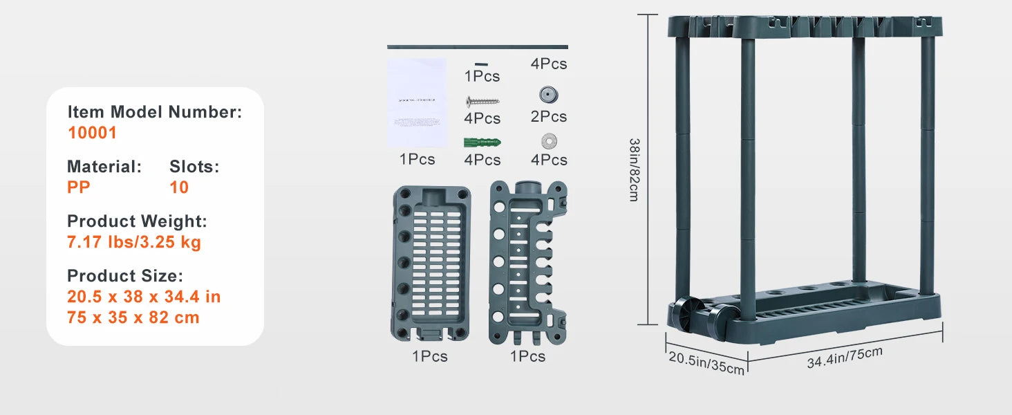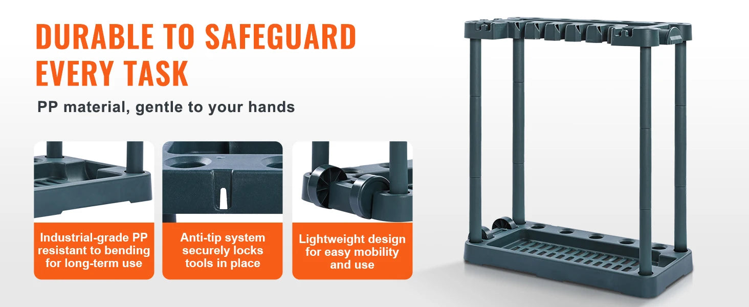 Built to Last: Crafted from top-quality PP (Polypropylene) material, this lawn tool organizer is tough against the elements and wear. It weighs just 7.17 pounds (3.25 kg) with all parts included. The sturdy vertical pipes enhance stability and load-bearing capacity, making it easy to move while staying rock-solid.