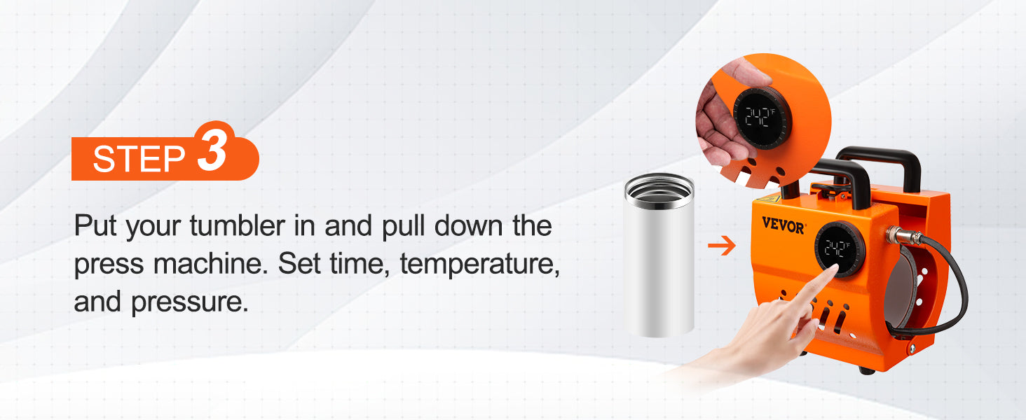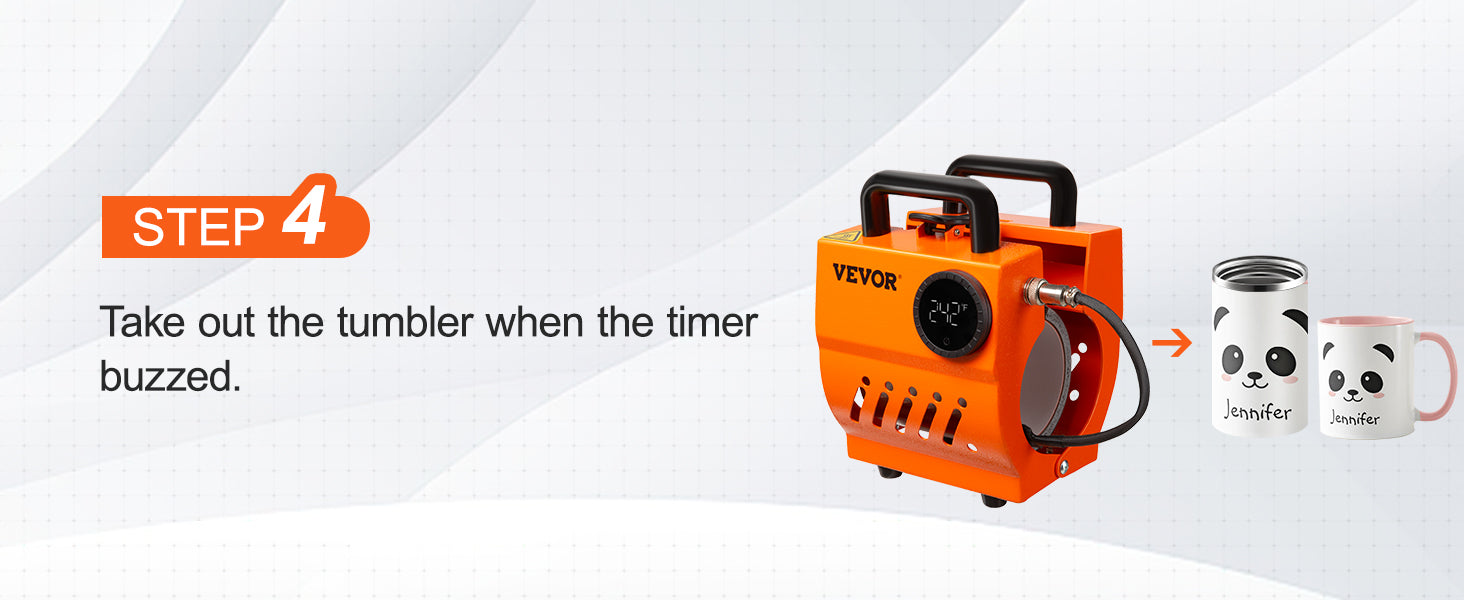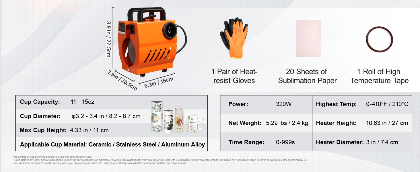 The Smallest Easy Press: You can easily pick this mini mug heat press up and store it in bags with a size of 6.3 x 7.87 x 8.85 inches, which is the the smallest VEVOR machine ever made. This heat press is designed specifically for the sublimation mugs diameter of 3.2 - 3.4 in / 8.2 - 8.7 cm, such as 11oz 12oz 15oz mugs.