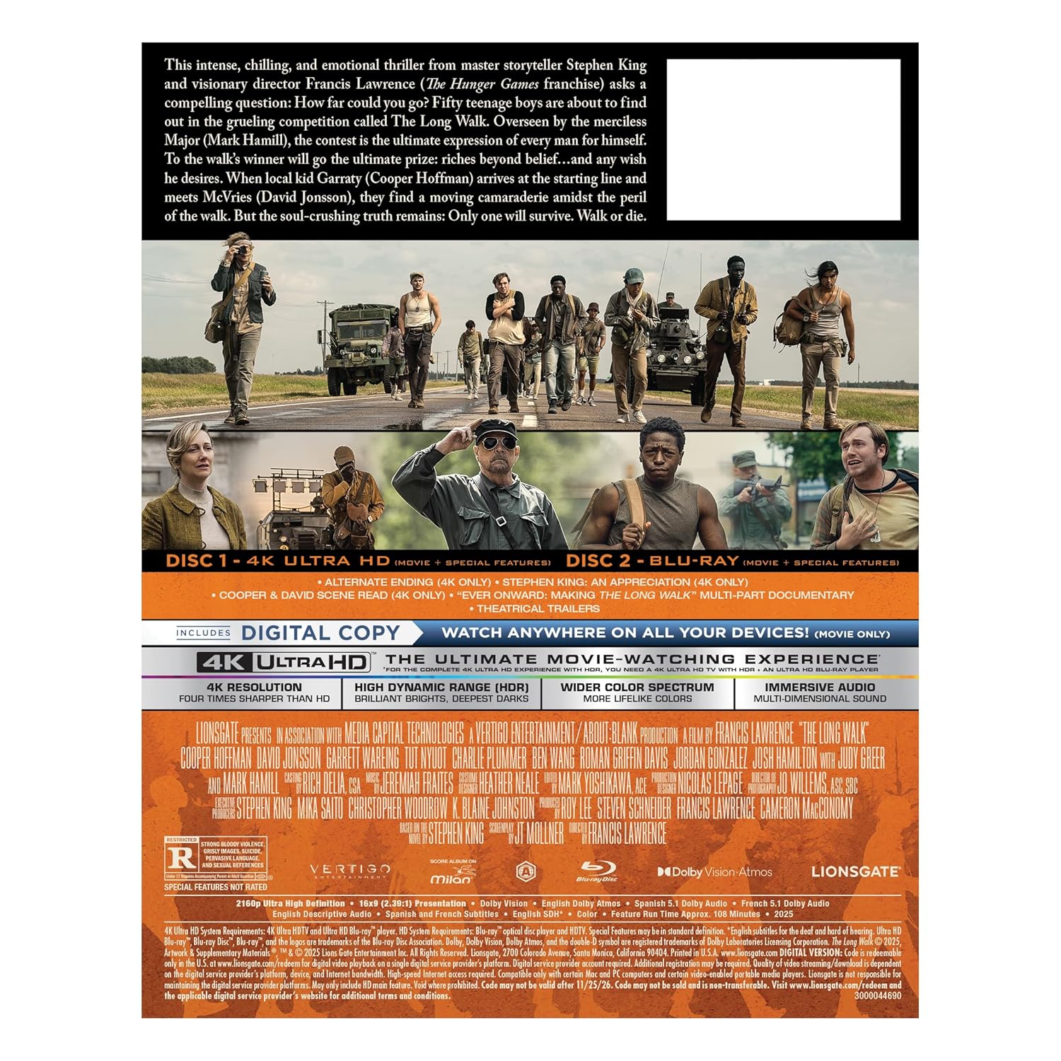 From visionary director Francis Lawrence comes The Long Walk, now presented in breathtaking 4K Ultra HD with Dolby Vision and Dolby Atmos sound. This release combines haunting imagery and unforgettable storytelling in a definitive edition made for collectors and cinephiles.