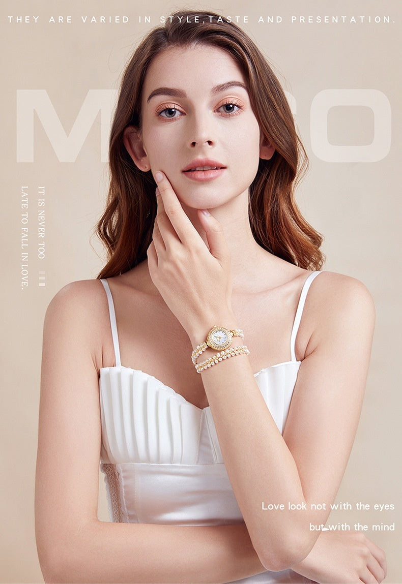 The watch features a beautiful gold color that adds a touch of glamour to your wrist. Its delicate design is highlighted by genuine freshwater pearls and dazzling diamond accents, offering a unique look that stands out from the crowd. With a thickness of just 9.7mm, this watch is lightweight and comfortable, ensuring it can be worn all day without any discomfort.